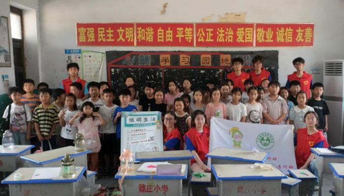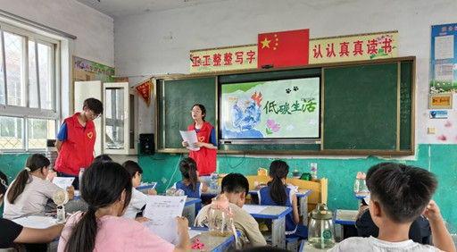 環保的未來在青少年。小分隊走進睢陽區宋集鎮魏莊小學,為50余名留守兒童開設“低碳先鋒”科普課堂。課程從碳足跡計算開始,隊員們引導孩子們計算日常出行、用電等行為產生的碳排放量,形成個人碳賬本,并通過互動問答學習減碳技巧。“我知道啦!洗菜水澆花,能省水又降碳!”三年級一位同學興奮分享。隨后的科普環節,隊員潘圓圓結合動畫短片與實物展示,深入淺出地講解垃圾分類與資源循環利用知識,將“碳達峰、碳中和”目標融入生活場景。這堂融合計算與科普的課堂,將綠色理念深植童心。