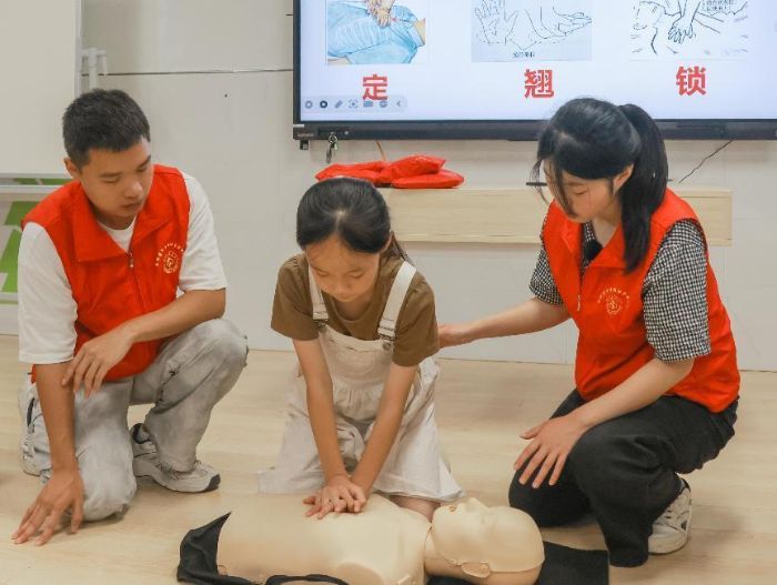 醫學急救課上,實踐隊隊員們將心肺復蘇、海姆立克急救法等專業知識,轉化為通俗易懂的語言和簡單易學的動作進行講解和示范。隊員鄭文璇一邊操作一邊講解:“大家看,進行心肺復蘇時,雙手要交疊,垂直按壓胸部,頻率每分鐘至少100次 。”孩子們紛紛上臺嘗試,在實踐隊隊員的指導下認真練習,力求掌握這些關鍵的急救技能。