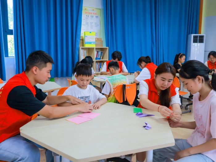 圖為實(shí)踐隊(duì)隊(duì)員手把手帶領(lǐng)小朋友完成折紙作品湖北日報(bào)通訊員高達(dá)攝