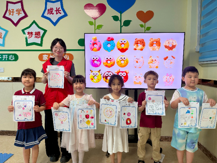 下午的繪畫課上,實踐隊隊員為孩子們講解甜甜圈的構成和畫法,鼓勵孩子發揮想象力,自己在紙上創作一款自己喜歡的甜甜圈,課上實踐隊隊員細心指導,孩子們沉浸在創作之中,增強了孩子的創造力創新力。