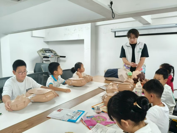 6月28日至7月1日,實踐隊圍繞“兒童安全”開展多場專項活動。在源園社區,隊員既強調防溺水“六不準”、游泳熱身要點,又現場演示CPR并指導小朋友實操;后續還開設《繃帶包扎小課堂》,通過“講解注意事項+示范三種包扎法+一對一指導”,讓孩子掌握實用急救技能。活動間隙,隊員還陪小朋友做游戲、輔導作業,用陪伴拉近與孩子的距離。