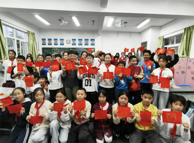 童心映金彩,薪火傳永續活動尾聲,學生自豪地舉起自己親手完成的紅底金紋木雕作品,每一幅都閃耀著獨特的匠心光芒。最后,全體學生與志愿者們手持作品,留下了一張成就滿滿、笑容燦爛的大合照,為這次融合了歷史、技藝與愛國情懷的美育之旅畫上圓滿句號。