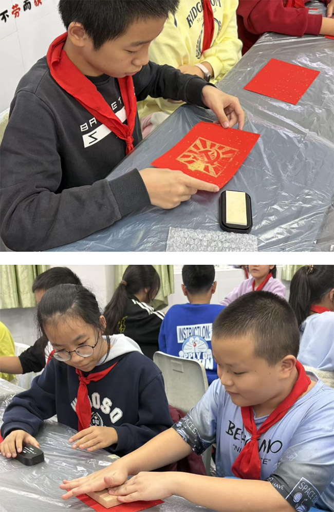 巧手拓神韻,金漆印童心在講解了金漆木雕的精湛工藝后,便進入了學生期待已久的手工環節。團支部的“小老師”們通過圖文和現場制作清晰演示了金漆木雕的制作步驟。隨后,志愿者們將材料分發給每個小組,并深入小組進行一對一指導。教室里,學生全神貫注,小心翼翼地操作,當金色的紋樣最終在紅色底紙上閃耀顯現時,教室里充滿了驚喜與贊嘆。在志愿者的耐心幫助下,一幅幅帶著金色光芒的小作品也逐漸誕生。
