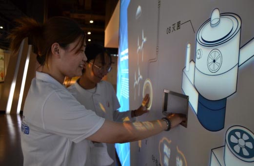 圖為實(shí)踐調(diào)研團(tuán)隊(duì)成員與數(shù)字化展板互動(dòng)體驗(yàn)銀杏果生產(chǎn)過程。