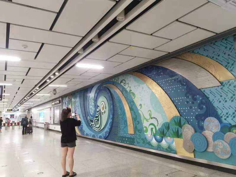 隨后,實踐團成員乘坐地鐵二號線進行進一步的調研。北苑站到了,實踐團成員首先對站名進行了研究,歷史上“北苑”曾是唐代宮廷北面的皇家園林,故命名為北苑。在北苑地鐵站內有皇家園林的典型要素--亭臺、小橋。該站的壁畫也和宮廷園林息息相關。其中,壁畫《變遷》,展示著交通文化的發展,以“車”為原型;有《金秋新綠》意為“綠色人文”主題,綠葉、古建筑、傳統紋飾,釉下彩、陶板、鍍銅工;有《吉祥磚雕》意為“連年有余”吉祥紋樣。下一站,安遠門站,安遠門,因臨近西安城墻正北門--安遠門而得名,古代中原漢族朝廷對邊遠少數民族采取懷柔安撫政策,所以把皇城北城門命名為安遠門。該站地鐵標識有西安城墻大北門(安遠門)箭樓。其中,壁畫《御守》意為守護家園、安撫遠邊;有《繁花似錦》意為大唐文化、唐代仕女、雍容華貴的仕女風貌。西安地鐵二號線,站點名稱與附近景點或與歷史政治等因素有著淵源。而每站的壁畫,也都貼合了該站點的形象和歷史。