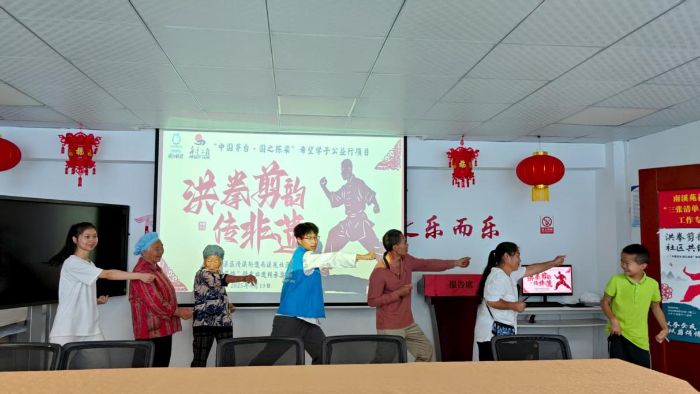 從探索到融合的活態傳承 此次實踐活動由茅臺助學金受助學子組成,彰顯了資助育人的顯著成效,展現青年力量,凝聚青春擔當。8月下旬,實踐隊充分發揮各專業特長,與花溪區益馨社會工作發展服務社攜手搭建了黔西北洪拳“活態傳承”的舞臺,積極探索社區基層活動的開展模式,制定貼合居民特點的創新性活動方式。在貴陽市花溪區清溪街道南溪苑社區、陽光街道學士社區,隊員們通過洪拳體驗、剪紙創作、趣味游戲、招式簡筆畫等形式,實現了“老幼共融傳非遺”,為黔西北洪拳的“活態傳承”提供新路徑、新方法。讓居民在動靜之間感受體育非遺的魅力,將洪拳“德行為先、堅韌向上”的精神內核融入社區教學,共同傳遞“中國茅臺·國之棟梁”的公益志愿精神,為社區注入溫暖與力量。