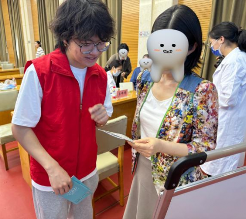 學生像是生長的樹苗,用豐沛的精力汲取專業的知識:碩博研究生對職工們進行一對一檢測,并做好記錄與專家討論后給出具體的治療建議;本科生志愿者則耐心為家屬們分發《口腔健康手冊》。雖然本科生志愿者對專業知識的掌握還不是特別深入,但他們積極地思考老師們為職工提出的每一個口腔問題。為職工們分發《口腔健康手冊》的同時,他們將書上的知識與現場的見聞相結合,為職工們講解一些常見的口腔健康常識。用鮮活案例活化單薄文字,在實踐中印證,在實踐中成長,逐漸在腦海中構成特有的口腔知識圖譜。
