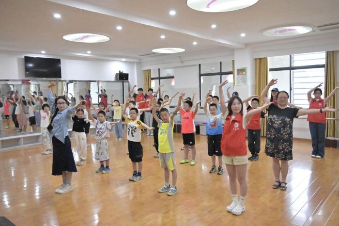 圖為志愿者在舞蹈課上帶領孩子們跳《開心往前飛》,同學們隨音樂舞動,為文藝匯演做準備。多彩大學生網通訊員黃夢婷攝
