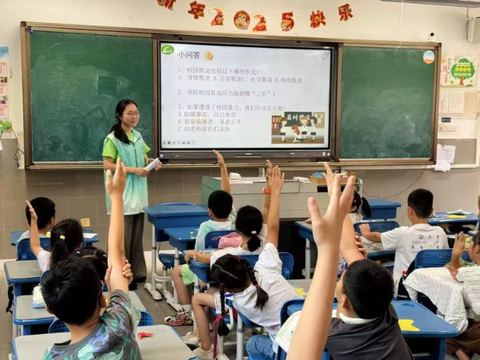 講解尾聲,團隊成員采用小問答的模式,有效地幫助孩子們加深印象,鞏固所學,懂得如何正確保護自己,堅決抵制校園欺凌。最后,團隊成員給孩子們分發小禮物,期望孩子們樹立起反校園霸凌的意識,將所學應用實踐,既學會保護自己,也懂得關愛同伴,共同營造一個和諧、安全的校園環境。