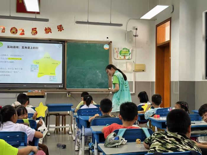 隨后,在“五角星上的我”互動環節中,團隊成員鼓勵孩子們在五角星的各個角上寫下自己的優點及不足,發掘自我。有的孩子在課堂上積極分享,有的孩子在團隊成員的引導下勾畫出了屬于自己的星星。此次活動幫助孩子們認識到自己獨特的優勢和價值,同時,從不同角度看待不足之處,增強孩子們的自信心,培養積極健康的自我認知。