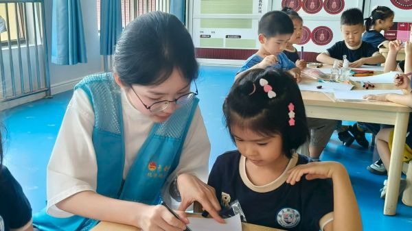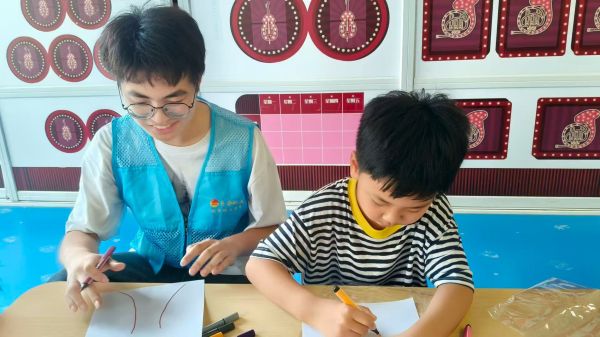 圖為志愿者教小朋友制作過程。王孝雨攝