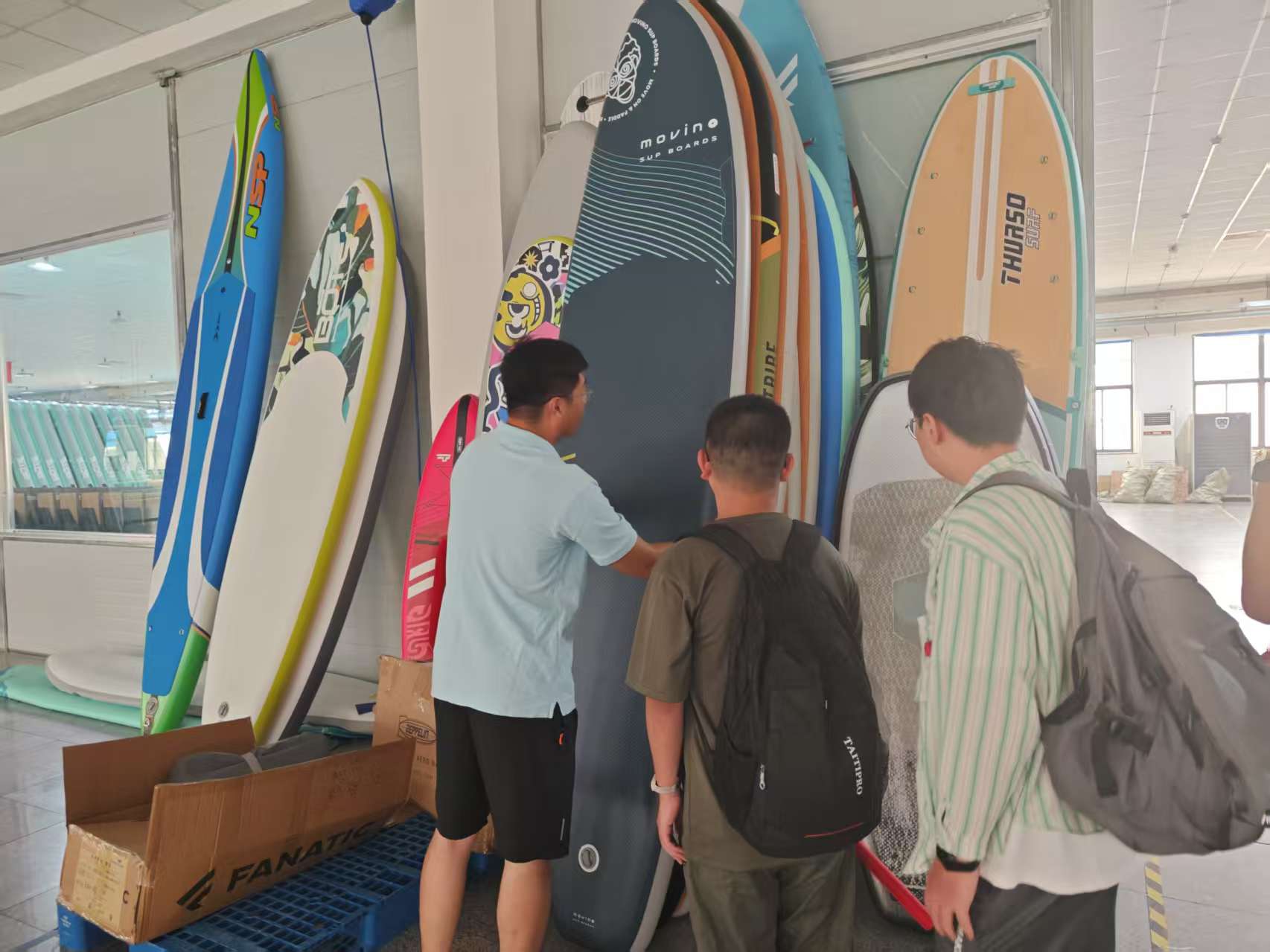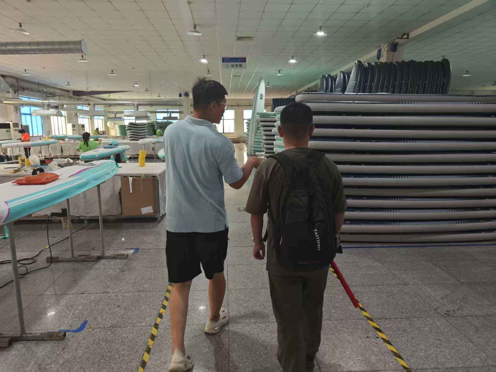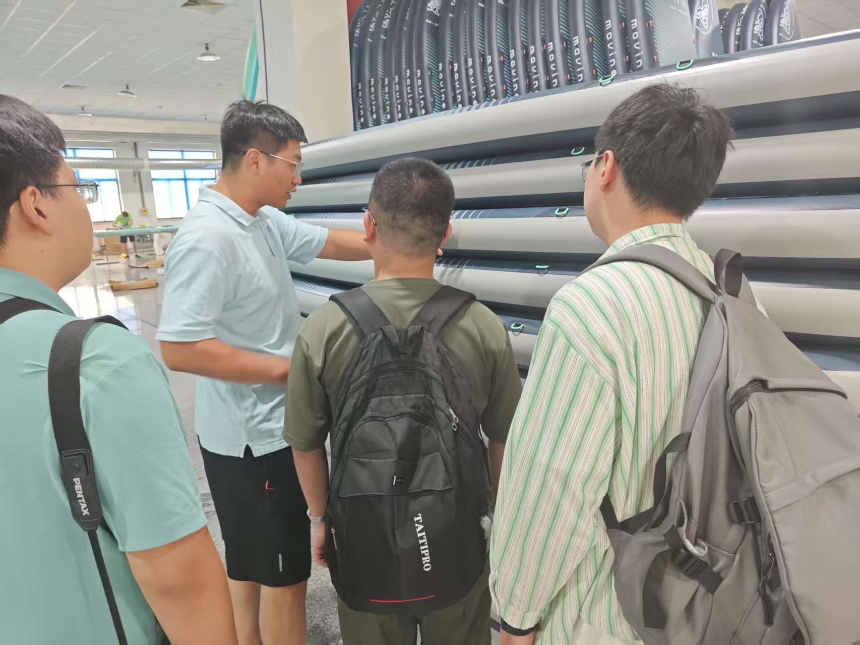 在公司工作人員的引領下,隊員們首先學習了充氣式槳板生產的工序。從切割原材料拉絲布到材料熱熔拼接,再到配件裝配,隊員們時刻關注溫度控制、拼接時間等關鍵因素,就不同材料熱熔時的特性差異,以及如何通過調整參數保證拼接質量等問題積極詢問。通過觀察工作人員切割拉絲布的操作,隊員們記錄普通槳板與高性能競速板關鍵部位尺寸設計之間的差別,思考切割精度對槳板整體性能的影響,深刻感受到標準化流程帶來的高效與精準。隊員們還查看裝配流程圖,對照實際裝配操作,分析裝配順序對槳板穩定性和功能實現的作用,了解噴涂工藝,包括涂料選擇、噴涂厚度控制等,切實體會生產過程中的力學原理與應用。在交流環節,隊員們提前準備了相關問題,與公司圍繞大創項目內容中的DIC技術(數字圖像相關法)展開深入探討。公司人員通過實際案例,向隊員們講解檢驗槳板性能的關鍵指標和核心區域,對隊員后續研究的區域提出了方向性建議。隊員們認真記錄關鍵信息,結合所學力學知識,與公司人員探討側面材料拼接處的力學問題。最后,紀禎和對公司現狀、行業前景進行提問。隊員們了解到,公司目前面臨著材料粘貼處高溫容易開膠這一主要問題。此外,國內外行業發展情況讓隊員們深刻認識到力學研究在解決實際問題、推動行業發展中的重要性。隊長紀禎和表示,隊員們會將此次參觀學習的成果帶回學校,在徐國強的指導下,進一步深入研究,努力為解決行業問題貢獻自己的智慧與力量。