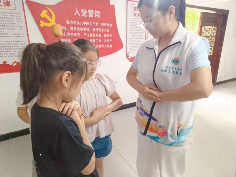 圖為實踐隊員余元元為兒童講解示范