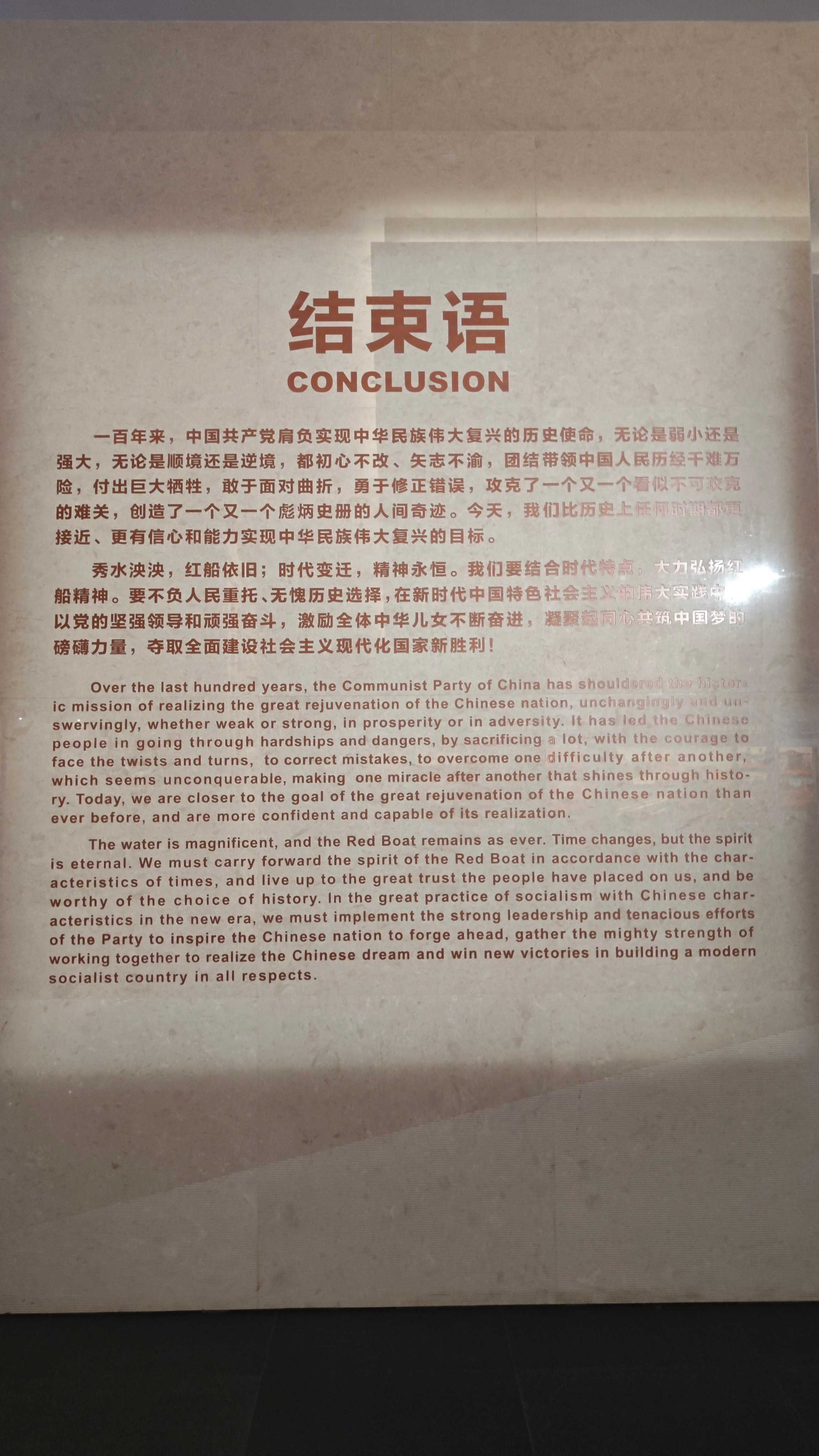 我們也從紀念館中展覽的一個個歷史事件中體悟到了中國共產黨偉大的紅船精神:開天辟地,敢為人先的首創精神;堅定理想,百折不撓的奮斗精神;立黨為公,忠誠為民的奉獻精神。目睹了近代以來的奮斗,我們也從后續的展廳了解了新中國成立以來以及改革開放以來中國共產黨的奮斗史和發展史。