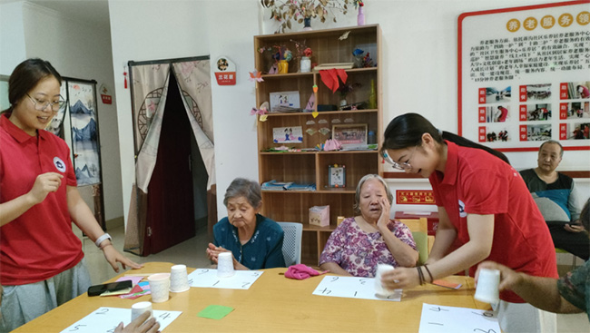 最富有創(chuàng)意的是紙杯乒乓球游戲,這是一個簡單但極具挑戰(zhàn)性的活動。使用紙杯搭在一塊,吹動乒乓球讓其掉落在紙杯中。該游戲旨在讓老人們在輕松愉快的氛圍中體驗運動的樂趣,同時也活躍了他們的身體機能。