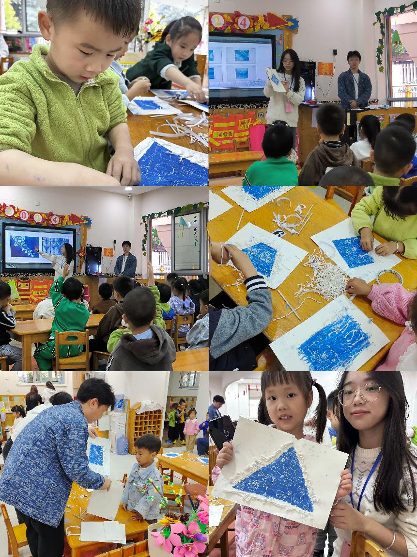 紙間染韻趣,色彩綻童夢。第二場活動走進丹桂幼兒園中班,主題為“紙上扎染”。隊員萬議鴻以PPT為媒介,用圖片、視頻等形式介紹扎染工藝的基本原理與民族特色。為中班兒童便于操作,項目組準備藍色油畫棒、棉條、畫紙等材料,引導孩子們通過折疊、繪畫等方式,在畫紙上創作出心中的圖案。孩子們紛紛展示自己的“扎染紙”,用普通話描述顏色和圖案,在游戲中提升了色彩感知與語言表達能力。