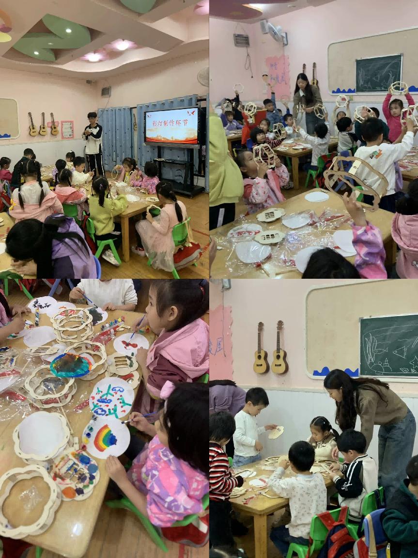 巧手繪彩燈,非遺亮童心。首場活動在圓圓幼兒園大班開展。團隊隊員周藝首先通過投影展示各式傳統彩燈圖片,介紹彩燈在春節、元宵等節日中的文化含義。接著分發材料:每人一套水彩工具、彩燈框架、膠水和宣紙。孩子們在隊員指導下,用水粉在宣紙上畫出彩虹、金魚、鮮花等圖案,學習將木框架拼接成立體形狀,將繪好的宣紙仔細粘貼在框架上。大班幼萌萌雙手舉著剛做好的彩虹彩燈,大聲向同伴介紹:“我的彩虹燈會發光!”活動現場二十余盞彩燈齊齊亮起,溫暖光芒映照著孩子們自豪的笑臉。