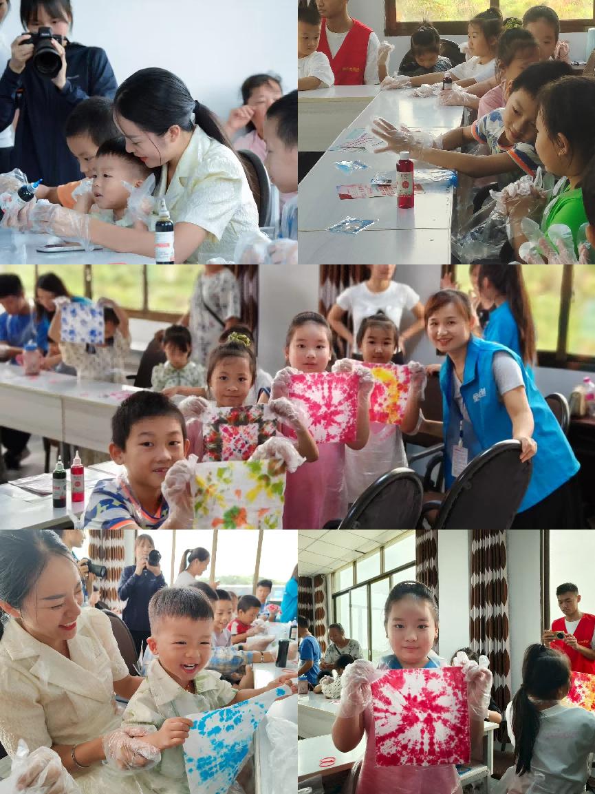 布里生花,巧手扎染傳承技藝。項目組聯合社區,在鄉村社區舉行扎染活動,聚焦傳統布料扎染。項目組準備了棉布、皮筋、板藍根染料等材料,現場演示了“螺旋扎”“條紋扎”等基本技法。成員協助捆扎布料、浸泡染液、拆洗晾曬。當一張張白布變成藍底白花的圖案時,孩子們興奮地舉起作品,充滿自豪感。活動不僅讓孩子們體驗到手工染布的樂趣,更在實操中理解了非遺技藝的工序之美。