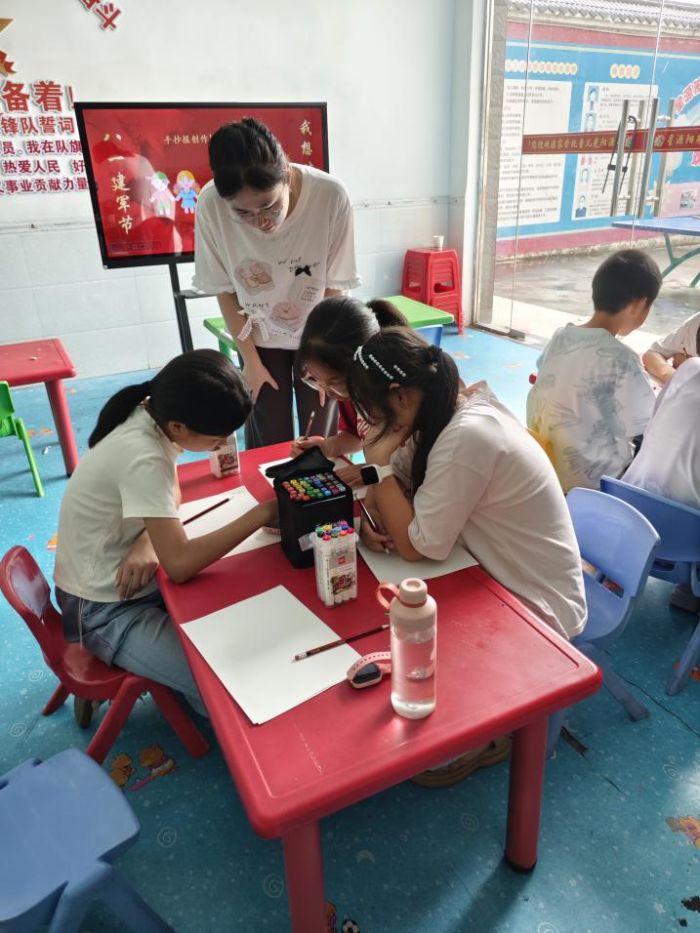 手抄報里述八一,筆墨之間敬軍魂。 結合“八一建軍節”的時間節點,實踐團以“手抄報創作”為核心載體,開展推普與紅色教育融合的實踐活動。活動現場,團隊成員徐鐲瑜為孩子們講述八一建軍節的歷史淵源——從南昌起義的槍聲到新時代軍人的使命擔當,用生動的故事、清晰的表達,讓紅色記憶在孩子們心中扎根。隨后,成員們發放畫筆、彩紙等創作材料,手把手指導孩子們以“述憶八一・語敬軍魂”為主題設計手抄報。孩子們筆下的手抄報色彩鮮艷、內容豐富,每一筆線條都飽含對軍人的崇敬,每一段文字都凝聚著對國家的熱愛,普通話成為串聯創意與情感的紐帶,讓紅色情懷通過語言與藝術的融合得以傳遞。