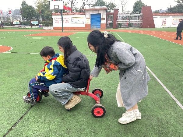 初到學校時,實踐隊和全校師生舉行了簡單的見面會,當天教室里格外熱鬧,孩子們圍坐在一起玩搶數字的游戲,陣陣笑聲飄得老遠。唯獨他,一個人縮在角落,小手揪著衣角,安安靜靜望著喧鬧的人群,半點沒湊上去的意思。察覺到我們的目光,班主任輕輕走過來,聲音放得很柔:“這孩子有點特殊,你們這幾天要是有空,多陪陪他就好。”我們這才知道他的情況,也默默記著班主任的叮囑。和他經過一上午的相處,當天下午他竟主動拉住一位實踐隊員的手,帶她走到一輛小紅車旁,拍了拍座位,仰起臉小聲說:“坐。”這看似平常的舉動,卻讓一旁的老師們感觸頗深。他們說,這孩子是一年前入學的,尤其是這學期,變化真的很大。“現在連上下樓都很穩當了,”一位老師輕聲回憶,“有一天我沒伸手扶,他自己攥緊扶手,一步一步慢慢地挪上了二樓。走到教室門口時,還忽然回過頭,沖著悄悄跟在后面的我笑了。”