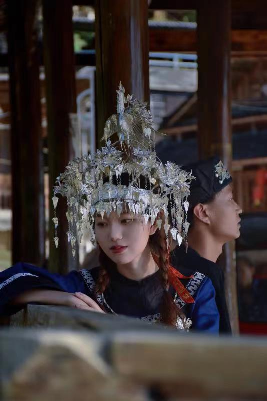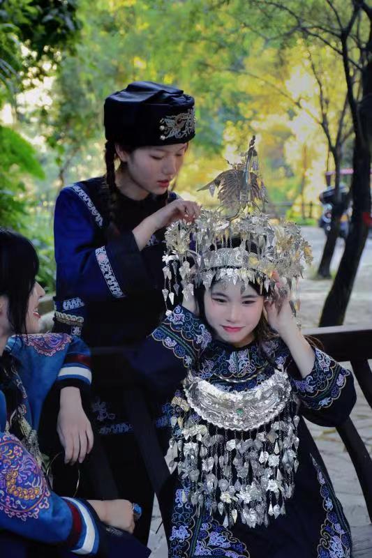 通過兩天的實(shí)地調(diào)研我們發(fā)現(xiàn)許多問題,首先,馬尾繡文化宣傳方面存在顯著問題。作為水族特色刺繡技藝,卻僅在當(dāng)?shù)亓鱾鳎叱鋈紖s鮮為人知,我們不僅感到惋惜,如此精美的刺繡不應(yīng)埋沒于此。帶著“民族”與“非遺”標(biāo)簽的馬尾繡文化應(yīng)走入更多人的視野。其次,我們更能發(fā)現(xiàn),馬尾繡文化傳承方面也存在一定的問題。當(dāng)?shù)啬贻p人對(duì)學(xué)習(xí)馬尾繡技藝興致不佳,政府引導(dǎo)的技藝學(xué)習(xí)活動(dòng)參與感較低。那么如何讓年輕人更喜歡這項(xiàng)技藝并愿意學(xué)習(xí)呢?我們結(jié)合當(dāng)下時(shí)代特色,迎合年輕人的愛好傾向,拍攝了一組馬尾繡服飾寫真。所用拍攝道具大多為國家級(jí)馬尾繡傳承人宋水仙女士支持物品,如:水族民間藏館內(nèi)的馬尾繡服飾、戒指、頭巾、手鐲、包包等。