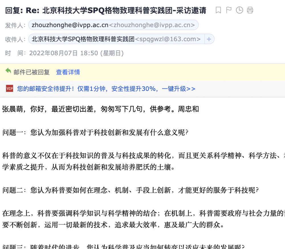 為深入了解群眾對科普的需求情況,團隊成員在線上發(fā)布科普需求情況調(diào)查問卷,成員們通過“您通過哪些渠道了解科學(xué)知識和科普教育”“您印象最深刻的科普教育活動”等16個簡單的小問題來了解當(dāng)前科普教育現(xiàn)狀和公民對于科普教育的重視程度。同時,團隊成員聯(lián)系到中國科學(xué)院周忠和院士采訪,通過了解“您認(rèn)為科普要如何在理念、機制、手段上創(chuàng)新,才能更好的服務(wù)于科技呢?”等問題,團隊及時調(diào)整科普方式,順應(yīng)時代發(fā)展要求。