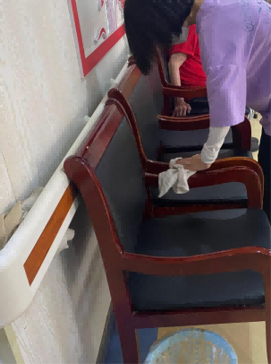 打掃衛生,盡心盡力老人房間的衛生清潔,護理員工們基本上都已打掃干凈,收拾妥當。經過護理員工的指導,隊員們用抹布擦拭大廳和走道的物品,為敬老院的老人提供力所能及的幫助與服務。