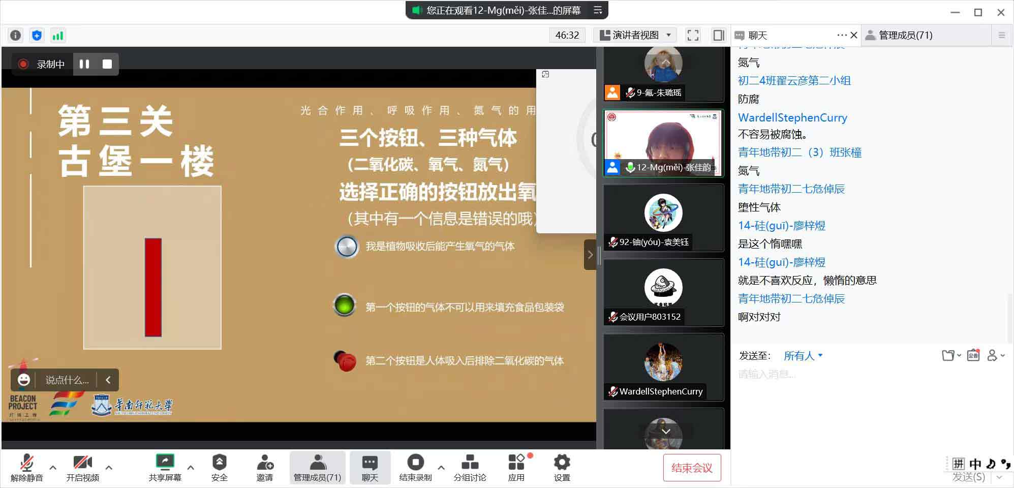 游戲化學(xué),寓教于樂。將游戲與化學(xué)知識(shí)相結(jié)合,以創(chuàng)新游戲理念普及化學(xué)知識(shí),是本次夏令營(yíng)線上課程的亮點(diǎn)之一。游戲化學(xué)課程之一《元素連連看》的三位授課老師帶領(lǐng)同學(xué)們學(xué)習(xí)元素周期表,開啟化學(xué)世界的大門。授課老師用“故事記憶法”、“讀字讀半邊”、“聯(lián)想記憶法”的小技巧幫助同學(xué)們記憶化學(xué)元素的中文名稱讀法,而后進(jìn)一步學(xué)習(xí)這些化學(xué)元素的性質(zhì)與特征來(lái)加強(qiáng)記憶,最后通過(guò)簡(jiǎn)單的連連看游戲,將元素中文名稱與符號(hào)一一對(duì)應(yīng)消除,檢驗(yàn)學(xué)習(xí)效果,讓同學(xué)們?cè)跉g聲笑語(yǔ)中掌握了化學(xué)知識(shí)。寓教于樂是教育活動(dòng)的最高境界,以情施教、情知交融、以樂助學(xué),可以使教育活動(dòng)收到事半功倍的效果。