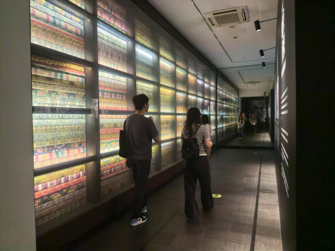 蘇州博物館內收藏著眾多與絲綢文化相關的珍貴文物,從精美的絲綢織物到古老的紡織器具,每一件都承載著蘇州絲綢數千年的歷史記憶 。踏入館內,成員們先是被一面陳列著絢麗紋樣的展墻吸引,透過玻璃,色彩斑斕的絲綢如歷史長卷,承載千年技藝緩緩鋪展。在陳列著歷代絲綢紋樣的展墻前,從戰國“菱形紋錦”的古樸雅致,到唐代“聯珠紋錦”的華麗精巧,文物無聲訴說“絲綢之府”的輝煌過往。聽講解員介紹宋代“纏枝牡丹紋宋錦” ,得知其從宋代墓葬發掘、歷經千年仍色澤依舊,眾人對蠶絲耐腐蝕性有了深刻理解。