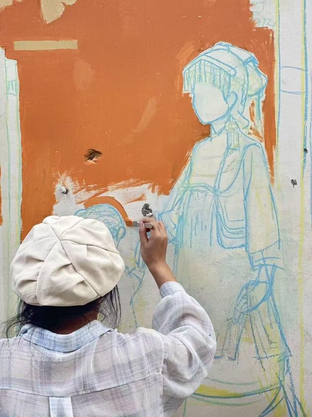 圖為墻繪中身著彝族服飾的人物示范文明通行場景。劉杭 供圖