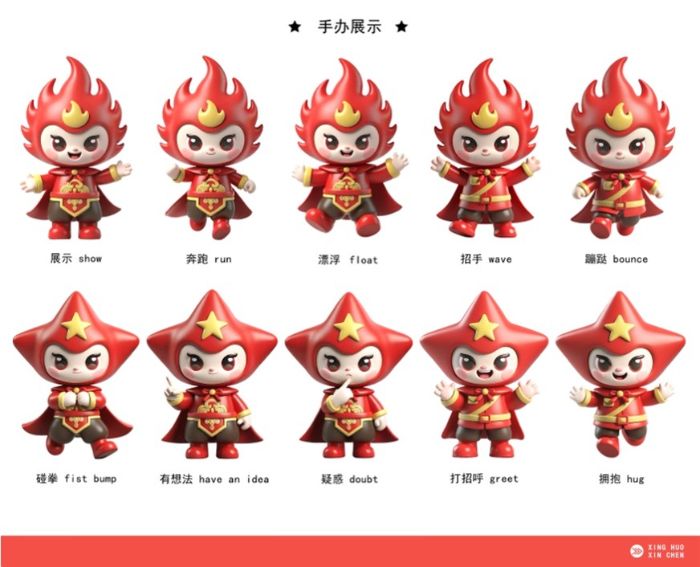 2.IP延展:意態(tài)多元 “星火”“薪晨”不僅命名寓意深遠(yuǎn),團(tuán)隊更圍繞其性格與身份,開發(fā)了豐富多元的表情系統(tǒng)、動態(tài)動作與主題服飾。無論是“星火”堅毅眼神的細(xì)膩刻畫,還是“薪晨”服裝上融入的地方傳統(tǒng)紋樣,每一處細(xì)節(jié)都凝聚著團(tuán)隊的匠心巧思。這些生動形象極富傳播力,精準(zhǔn)契合了當(dāng)下新媒體環(huán)境中表情包、文創(chuàng)產(chǎn)品等內(nèi)容形態(tài)的傳播需求,為傳統(tǒng)文化符號注入現(xiàn)代情感表達(dá)的活力。