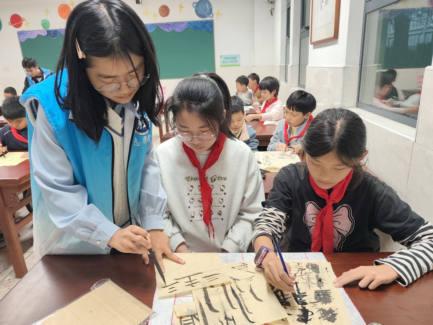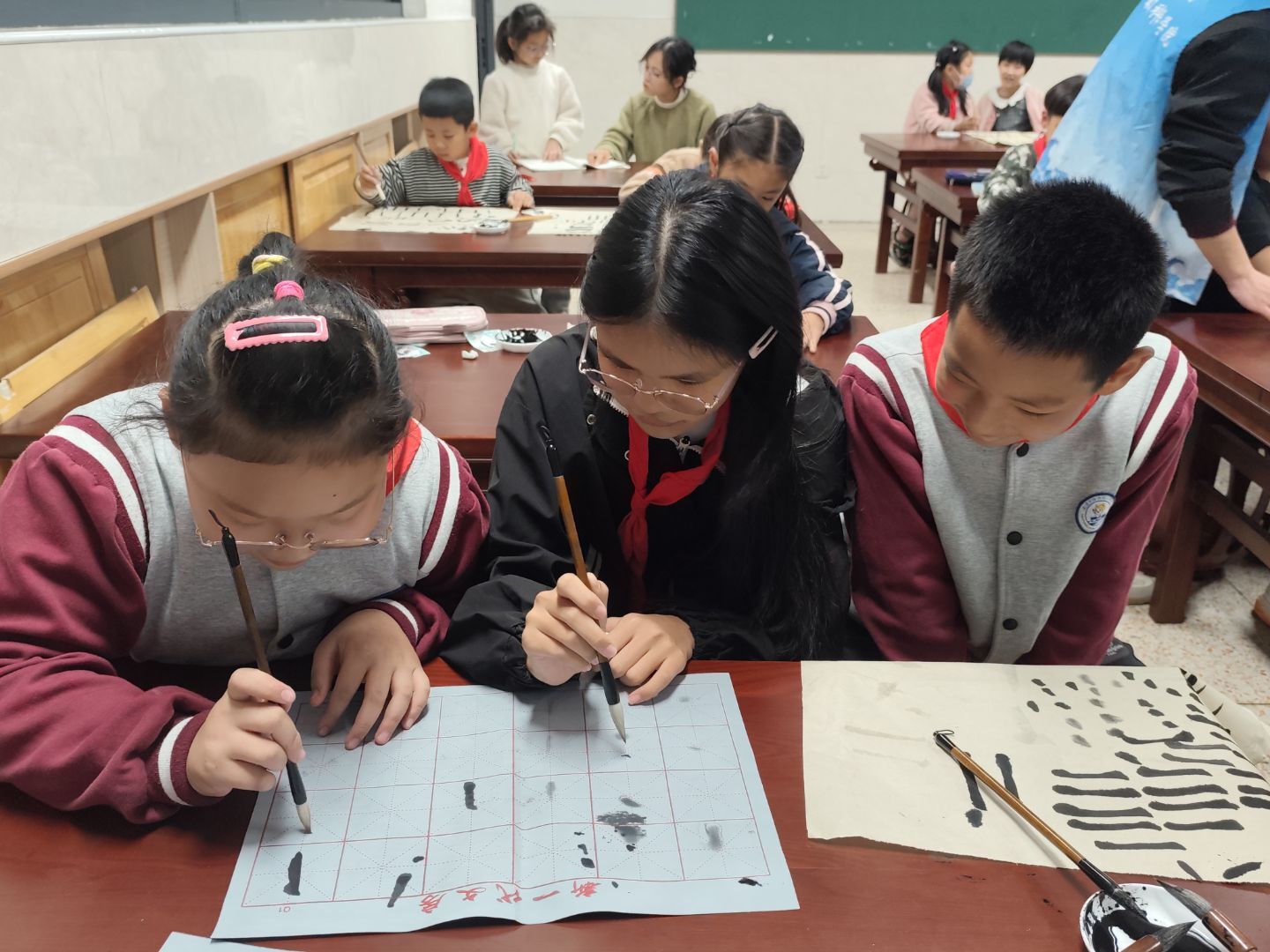 筆墨承文脈,書香潤童心。當最后一筆收鋒,孩子們舉著自己的作品圍在“小老師”身邊合影,陽光落在他們帶墨漬的小手上,也落在那些略顯笨拙卻充滿靈氣的字跡上,將這一刻的美好永遠定格。