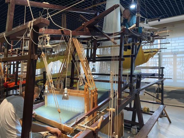 一步入南京云錦博物館,實踐團就被栩栩如生的云錦作品所震撼。細膩的針腳,繁復的紋樣,無一不展現出織造者手藝的精湛。博物館的云錦操作展廳內,錯落擺放著十二架龐然大物,這正是云錦的織造工具——云錦傳統木織機,又名“斜身式大花樓提花織機”。現場還有織手正在織作云錦,而學習體驗云錦織造技術,正是實踐團此行的主要目的之一,成員們立刻前去觀摩學習。