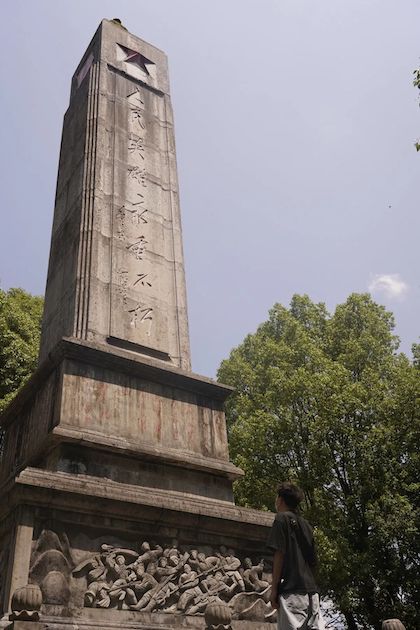 進入陵園內部首先看到的是高聳的革命烈士紀念碑。紀念碑用青石砌成,高14.2米,四周圍繞平座欄桿,。碑面陰楷鐫刻“革命烈士紀念碑“,左右分別鐫刻朱德,鄧子恢的題詞:”革命烈士永垂不朽!“、”英明不朽浩氣長存“,碑頂塑有持槍戰士石像一尊。