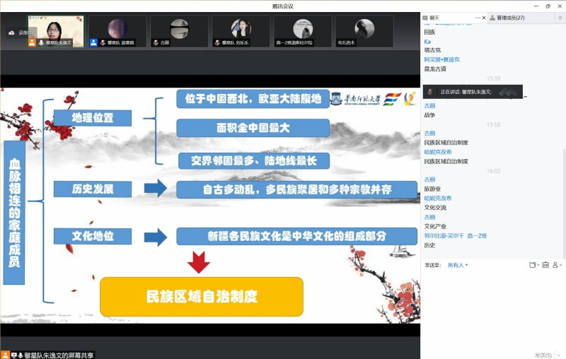 為貫徹落實習(xí)近平總書記的講話精神,朱逸文為她的課取了一個充滿寓意和詩意的名字——“石榴花開映天山”,將“新疆歷史和民族發(fā)展史”作為其中的重要內(nèi)容,并且重點闡述新疆各民族作為中華民族血脈相連的一部分的理論和現(xiàn)實依據(jù)。她希望通過她的講述,能夠增強當(dāng)?shù)赝瑢W(xué)們的中華民族共同體意識,提高同學(xué)們的愛國主義實踐能力。為了上好這一門“民族團結(jié)課”,她進行了多次的試講,將課件和講稿反反復(fù)復(fù)地修改了七八遍。“即便是這樣,當(dāng)我真正看到一個個同學(xué)進入線上課室的時候,還是感到非常緊張和激動。”她說道。