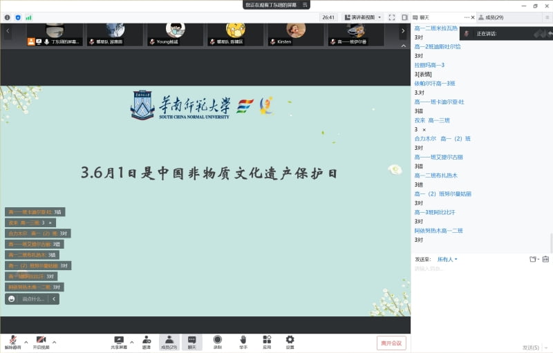 7月22日下午,華南師范大學哲學與社會發展學院馨星隊全體成員與新疆維吾爾自治區喀什市深塔中學的高一同學們跨越4160公里的距離,在“云端”上舉行閉營儀式。在隊長馬英柏的主持下,為期5天的“非遺牽起文化結,認同澆灌民族花”云下鄉活動正式落下帷幕。