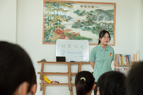 夏暑未散,熱情也未曾消減。今年夏天,文學院青燁隊響應號召,來到了廣州市增城區派潭鎮大埔村,進行了為期5天的支教活動。在這段特別的旅途中,青燁隊在大埔村留下了專屬足跡,書寫了獨家記憶。8月8日上午9時,華南師范大學文學院團委青燁隊舉行結營儀式,由青燁隊朱可瑩、劉國鑄及兩位小朋友溫紫珺、賴欣怡擔任主持人,儀式分為隊長致辭、課程匯報、獎狀發放、唱隊歌、寫明信片四個環節。