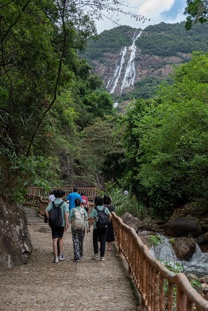 8月6日,調研組一行前往白水寨景區進行實地走訪。在一片煙雨蒙蒙中,組員們從山腳出發,沿著幽靜清涼的山道一路踱步而上,穿梭在媲美原始森林的山林之中。不遠處,瀑布破開云霧從山頂奔流而下,雷霆萬鈞,又如萬馬奔騰,有“疑是銀河落九天”之聲勢。