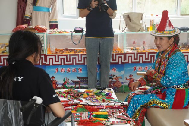 除了主線任務(wù)支教之外,隊(duì)員也走訪了當(dāng)?shù)剜l(xiāng)政府,在當(dāng)?shù)卣榻B下采訪了頗有名氣的裕固族繡娘白英老師。白英老師自甘肅肅南嫁到黃泥堡裕固族鄉(xiāng),是當(dāng)?shù)赜忻脑9檀汤C大師。“絲線縱橫,文學(xué)傳承”,白英老師不僅是裕固刺繡的能工巧匠,在裕固語言方面也極有造詣。迢迢牽牛,皎皎河漢,芊芊素手,扎扎弄機(jī);淺淺羅床,淡淡煙幕,綺綺羅香,寂寂抒懷。白英老師用自身的熱情與知識(shí)全身心投入裕固文化的傳承與保護(hù)中,在弄玉桂云中傳承刺繡文化,在黨慕清芬中訴說裕固豪情。不止于此,我們還在裕固族語言傳承人安翠花老師的帶領(lǐng)下進(jìn)一步了解了裕固文化的多彩與傳承困境。安老師向我們講述了自1983年執(zhí)教裕固族語言以來裕固族民族文化傳承以及裕固族語言教學(xué)的發(fā)展路徑與困頓,言語之中盡是對(duì)民族文化發(fā)展現(xiàn)狀的深切擔(dān)憂。在與鄉(xiāng)長的溝通交流中,我們還了解到,早在2010年,裕固族語言就被列入全國非物質(zhì)文化遺產(chǎn)保護(hù)名錄,但是,隨著社會(huì)的發(fā)展進(jìn)步,黃泥堡地區(qū)裕固族文化逐漸消亡,裕固族語言更是近乎失傳。在裕固族民族文化發(fā)展前景慘淡的當(dāng)下,民族文化教育以及傳播顯得至關(guān)重要。近年來,當(dāng)?shù)剜l(xiāng)政府和各類民族文化研究者也在作出各種嘗試和改變,長路漫漫其修遠(yuǎn)兮,吾將上下而求索!