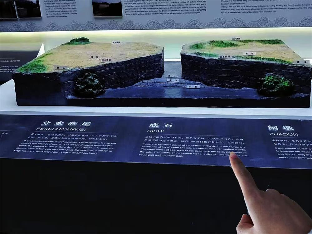 實踐隊員進入博物館,映入眼簾的便是一艘木帆船,腳下是透明的玻璃,近看發現坡璃下還流著清澈的水,四周映射出五顧方色的燈光,仿佛置身在大運河中。處在大廳正中央,是一座生動形象的聊城水城水系電子互動沙盤。實踐隊員乘電梯到博物館四層,才可把沙盤風景盡收眼底,藍水綠地,有運河流過的地方到處都是蒼翠欲滴。再一次詮釋了“運河成就聊城”的佳話。博物館共分為三個展廳,分別為“史前時期展廳”“商周秦漢-魏晉隋唐展廳”“宋遼金元-近現代展廳”,其中陳列著國家一級文物有磨喝樂宋代陶模、宋金線紋罐以及金鶴壁窯黑釉雙系凸線紋罐、漢羊首陶瓶、金龍泉窯瓷香爐、清釋迦摩尼佛、清圓雕白玉臥馬等文物,這都得益于城鎮建設與運河開發保護。