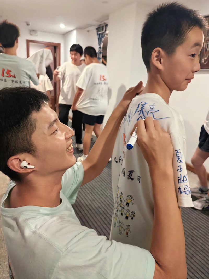 另外,夏令營(yíng)結(jié)束前夜,孩子們還相互在營(yíng)服上簽下姓名和想說的話作為紀(jì)念。其中,小詩(shī)人邵安為“冬日”團(tuán)隊(duì)的蝦滑哥哥作了一首《念蝦》,記錄與蝦滑哥哥的相處的情景,表達(dá)即將分別的不舍。文采斐然,深受志愿者哥哥姐姐們贊揚(yáng)。