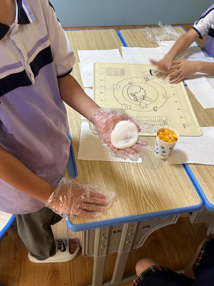 理解“粒粒皆辛苦”的來之不易,莫過于親手體驗食物的創造過程。在這節特殊的課堂內,彌漫著甜蜜與歡樂的氣息。孩子們化身小小“糕點師”,在志愿者們的安全指導下,動手體驗制作“雪媚娘”和“手搓冰粉”。揉搓預拌粉、包裹香甜餡料、觀察冰粉籽在涼水中釋放果膠的神奇變化……每一個步驟都蘊含著食品科學的奧秘。“自己做的雪媚娘真好吃!”“冰粉原來是由這個搓出來的呀?”品嘗著自己親手完成的作品,孩子們臉上洋溢著成就感和幸福的笑容。這堂特殊的“化學課”,將抽象的物質變化原理轉化為可觸可嘗的美食體驗,讓孩子們在享受甜蜜的同時,深刻理解了食物制作背后的科學原理,感受到勞動創造價值的喜悅。
