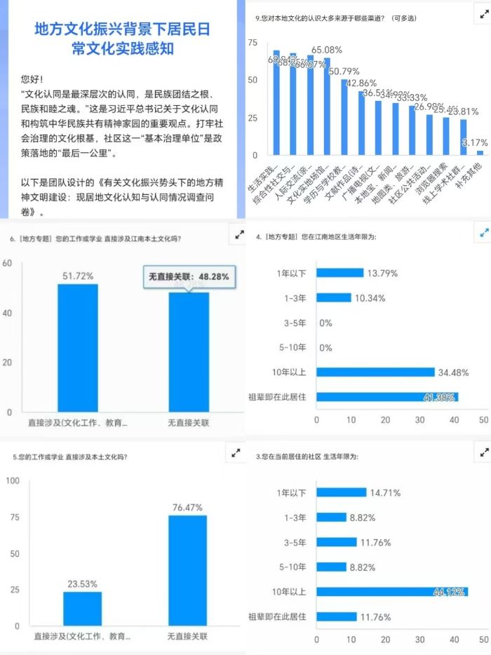 在七月下旬,北斗七星實踐隊開展了一項關于"地方文化振興背景下居民日常文化實踐感知"的問卷調查。受訪者以18-25歲群體為主,超過一半人現居在或熟悉江南地區。調查顯示超七成受訪者與江南地區有長期居住或家族淵源,說明其對本土文化有天然的親近基礎;然而,近八成受訪者的工作或學業與本土文化無直接關聯,顯示出本土文化在日常職業與學業場景中滲透不足,文化與生活、工作的結合度有待提升。且居民了解本地文化的主要渠道是生活實踐、文旅體驗、社交平臺及人際交流,體現出文化認知更偏向于非正式、生活化的場景,而傳統的文化場館等正式渠道雖有一定占比,但并非核心,提示文化傳播需更注重融入日常場景。本次問卷調查報告為團隊指明了促進地方文化認同與文化振興的方向。