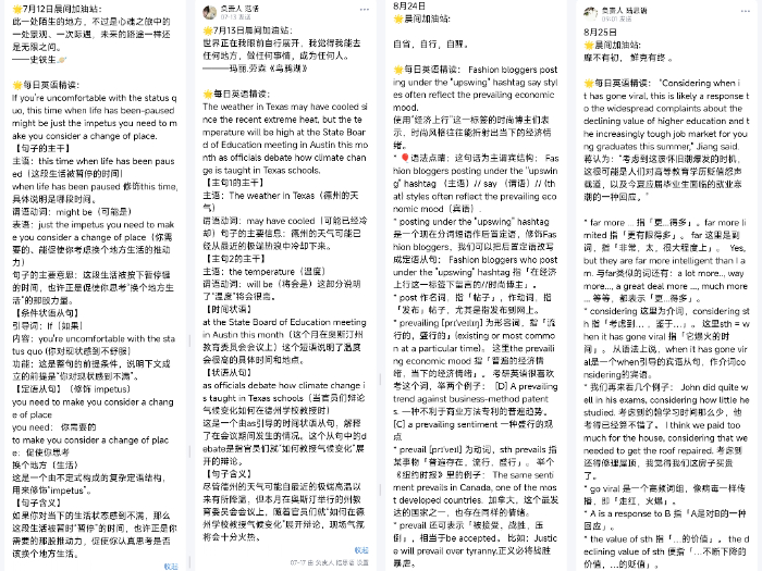 自7月10日起,志愿活動全面展開。每日清晨,學員會收到“晨間加油站”鼓勵信息及精選英語閱讀材料。每周三、周六晚間舉行小組線上答疑,共計開展40場,累計時長超100小時。答疑內容不僅涵蓋解題方法,還包括備考心態調整與復習計劃制定。多位志愿者分享個人備考經歷,幫助學員有效“避坑”,引導學員增強信心。
