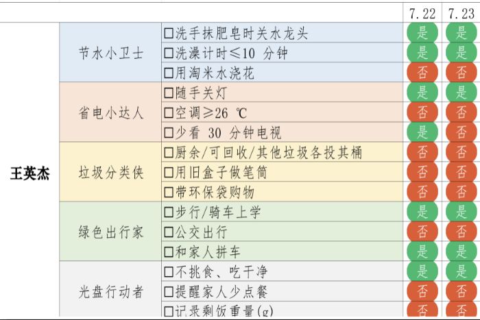 為推動環保從“知識”到“行動”落地,小分隊推出“環保打卡”活動,設計節水、節電、垃圾分類、綠色出行等打卡任務。學生們積極參與,洗手及時關龍頭、用淘米水澆花、步行上學、光盤行動……一張張打卡表,記錄著日常環保實踐。