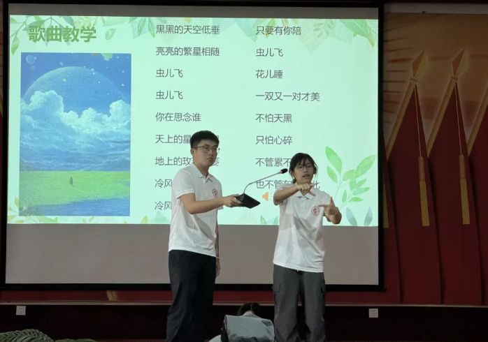 “手語會開花”課堂上,實踐團(tuán)以童謠《蟲兒飛》為創(chuàng)意載體,精心設(shè)計趣味教學(xué):教孩子們用手掌模擬“夜空低垂”,用指尖輕點再現(xiàn)“繁星閃爍”,把“你好”“謝謝”等手勢化作連接有聲與無聲世界的紐帶。當(dāng)夕陽下,孩子們舉著小手,用略顯笨拙的動作同步演唱童謠時,實踐團(tuán)成員深切感受到,這場由團(tuán)隊主導(dǎo)的手語啟蒙,不僅播撒了語言交流的種子,更讓“尊重差異、傳遞溫暖”的理念扎根童心,成為一堂兼具溫度與意義的成長課。