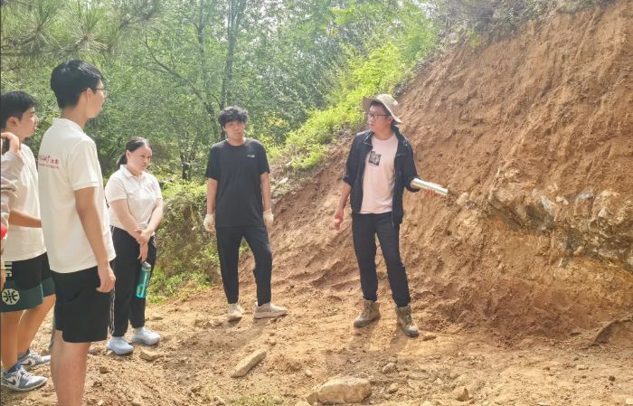 圖為實踐團(tuán)成員進(jìn)行地質(zhì)科普小課堂+周思衡攝 沿著古將村在建的觀光棧道,實踐團(tuán)成員相互攙扶向上攀登——面對崎嶇路況,團(tuán)隊始終以探索鄉(xiāng)村發(fā)展的熱忱前行。這條步道雖未完工,卻讓成員們清晰感知到其承載的鄉(xiāng)村旅游增收期望。登頂時,群山環(huán)繞、村莊錯落的美景盡收眼底;下山途中,實踐團(tuán)主動與修路工人深入交流,從“再難也要把路修好”的質(zhì)樸話語里,深刻讀懂鄉(xiāng)村振興的艱辛與堅守。