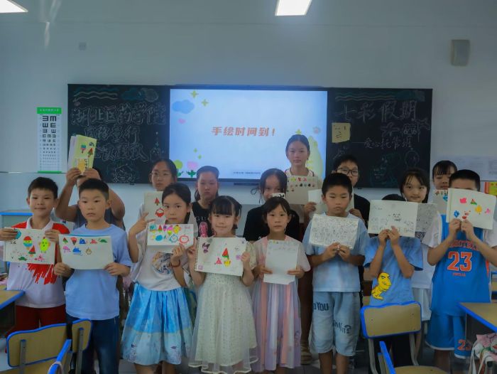 在王家坪紅軍小學,傳統文化與創意表達成為課程的核心。書法課堂上,隊員們手把手指導孩子們練習毛筆字,從橫平豎直的起筆規范到利落有力的收鋒技巧,耐心糾正每一個細節。隨著課程推進,孩子們筆下原本稚嫩歪扭的字跡逐漸變得工整有序,專注的眼神中透露出對傳統文化的濃厚興趣,墨香裊裊間,傳承的種子悄然扎根。手繪課上,隊員們摒棄“標準答案”的束縛,鼓勵孩子們釋放天性——紙上綻放出形態各異的冰淇淋、長著翅膀的星星等充滿童趣的作品,每一筆線條都承載著孩童獨有的想象力與創造力,成為夏日里最生動的注腳。