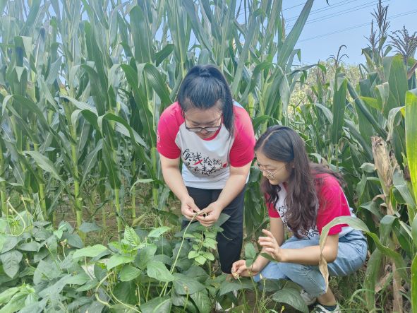 我們到達之后,通過交談,逐漸與村民熟絡起來。隨后,我們跟隨村民來到農田里切身體驗勞作的感覺。學習和了解了多種農作物,村民也耐心為我們講解了一些農作物的采摘技巧,我們受益匪淺。