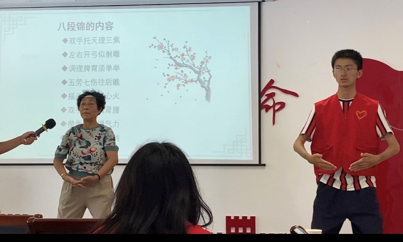此外,實踐團成員還向社區(qū)居民普及了八段錦的由來、功效和具體動作。在宣講過程中,實踐團成員上臺展示八段錦。當爺爺奶奶們跟著實踐團成員一起做動作時,有一位奶奶突然表示自己也十分擅長八段錦,每日早晨鍛煉都會練習。于是在實踐團成員的應邀下,奶奶和志愿者一起進行了功法演示。